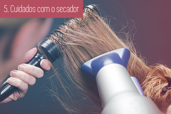 Ao secar o cabelo, evite o uso da escova para esticar os fios. Invista em um secador com íons e boa potência pois quanto mais rápido o cabelo secar, menos tempo ele fica superaquecido. E não esqueça de usar o protetor térmico.