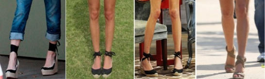 Sem dúvida alguma são as espadrilhas. Com salto de corda, superconfortáveis e superaltas. Ficam lindas com minissaia e camisa colorida por dentro ou com uma calça flare (com pernas soltas e boca levemente aberta) e uma bata.